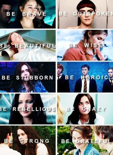 "Перси Джексон": Каждый может быть героем. "Голодные игры": Огонь будет пылать, а войны свирепствовать, но надежда всегда продолжает жить. "Орудия Смерти": Если ты любишь что-то, тебя ничто не остановит. "Книжный вор": В твоих словах есть сила. "Дивергент": Будь бесстрашным. "Хорошо быть тихоней": Не бойся принять себя таким, какой ты есть. "Над пропастью во ржи": Ничто не длится вечно. "Виноваты звезды": Даже смерть не может победить любовь. "Гарри Поттер": У нас всегда есть что-то, за что стоит бороться. #fandom