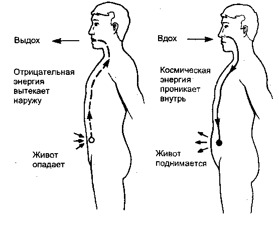 На втором этапе повторите уже освоенные движения, но, нажимая на живот, мысленно представляйте, как негативная ци (отрицательная энергия) поднимается из живота вверх по корпусу и вытекает изо рта (рис. 6). Тренируйтесь по меньшей мере две недели, прежде чем перейти к следующему этапу. Постепенно увеличивайте число счетов, нажимая и отпуская свой живот. Время задержки дыхания оставляйте неизменным — два счета.