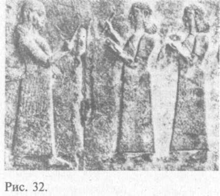По внешнему виду, как отмечают исследователи, шумеры своеобразны, и их трудно спутать с другими народами. Они были круглолицыми, коренастыми, с крупными носами, мужчины не имели бород и усов (рис. 29). Напомним, что сами себя они называли "санг-нгига" ("черноголовый народ"; по-аккадски — "цальмат-каккади") [102, с. 54]. Постепенная, мирно протекавшая ассимиляция с семитскими кочевыми племенами аккадцев, проникавшими в Двуречье с северо-запада, определенно изменила первоначальный облик "черноголовых". Аккадцы были более стройными, имели продолговатые лица; мужчины носили усы, бакенбарды и длинные бороды (на рис. 30 — отливка из бронзы).