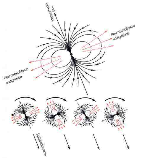 В случае пульсаров мы считаем, что пульсации обусловлены вращением нейтронной звезды. Подобно большинству небесных тел, наши компактные объекты обладают, скорее всего, магнитным полем, и, как и у Земли, магнитная ось может не совпадать с осью вращения. Движение космического вещества поперек силовых линий затруднено, поэтому на компактный объект вещество будет падать преимущественно в области его магнитных полюсов (рис. 10.11). Рентгеновское же излучение возникает там, куда падает вещество, т. е. вблизи полюсов. А распространяться оно будет в стороны, поскольку в направлении магнитной оси его поглощает падающее вещество. Если компактный объект вращается, то для удаленного наблюдателя рентгеновское излучение будет пропадать всякий раз, когда к нему обращен тот или другой магнитный полюс. В остальное время рентгеновское излучение появляется вновь (рис. 10.11).