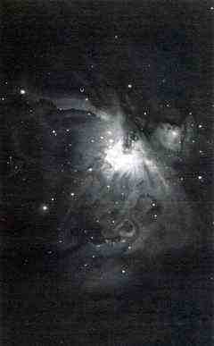 Рис. 12.1. Светящаяся туманность Ориона. В области протяженностью около 15 световых лет межзвездный газ сильно уплотнен; один кубический сантиметр содержит до 10000 атомов водорода. Хотя по межзвездным меркам это очень высокая плотность, разрежение газа здесь намного выше, чем в лучших вакуумных установках на Земле. Вся масса светящегося газа составляет примерно 700 солнечных. Свечение газа в туманности возбуждается светом ярких голубых звезд. В туманности Ориона имеются звезды, возраст которых меньше миллиона лет. Наличие уплотнений позволяет считать, что образование звезд продолжается здесь до сих пор. Свет туманности, принимаемый нами сегодня, в действительности был излучен туманностью в эпоху Великого переселения народов. (Снимок Военно-морской обсерватории США, Вашингтон.)