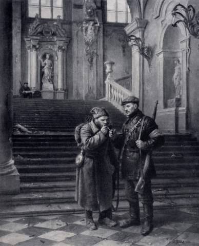 В первые послевоенные годы в живописи ощущаются мысли и чувства недавних военных лет. Создается много батальных композиций, в которых воспевается подвиг народа в минувшей войне. Художники по-новому начинают видеть и революционную борьбу в прошлом. Тема народа — творца истории — получает яркое раскрытие во многих произведениях. Естественно, что художники вновь и вновь обращаются к образу В. И. Ленина, стремясь не только раскрыть величайшую многогранность и глубину этого образа, но и выразить мысль о роли Коммунистической партии в революционной борьбе и становлении нового общества.