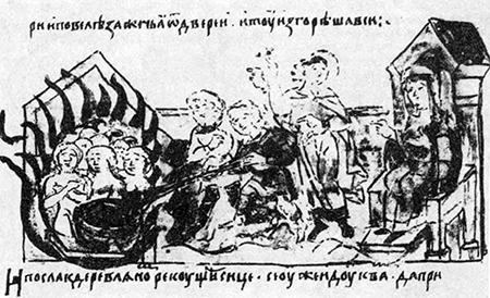 Спалюють деревлянських послів. Мал. XIII (XV) ст.