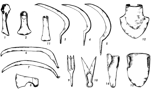 Сільськогосподарські знаряддя. XI–XII ст. 1, 2, 11 — мотики; 3–5 — серпи; 6, 7 — коси; 8 — топір; 9 — острога; 10 — ножиці для стрижки овець; 12, 13 — лемеші плугів; 14 — леміш сохи.