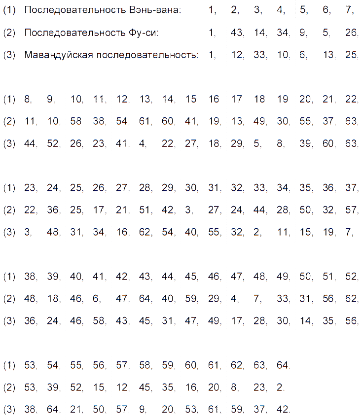 Поскольку секрет расположения гексаграмм в порядке Вэнь-вана пока не раскрыт, закономерности его взаимосвязей с расположениями Фу-си и мавандуйским неясны. Два последних расположения, естественно, преобразуемы друг в друга по алгоритму, задаваемому соотношением соответствующих расположений триграмм. Гексаграммы обычно, как и в работе Ю.К.Щуцкого, указываются по их номерам в порядке Вэнь-вана. С помощью этих номеров мы воспроизведем здесь порядки Фу-си и мавандуйский, что, дополняя схемы 8, 9, 11, позволит в линейном аспекте представить соотношение всех трех последовательностей гексаграмм.