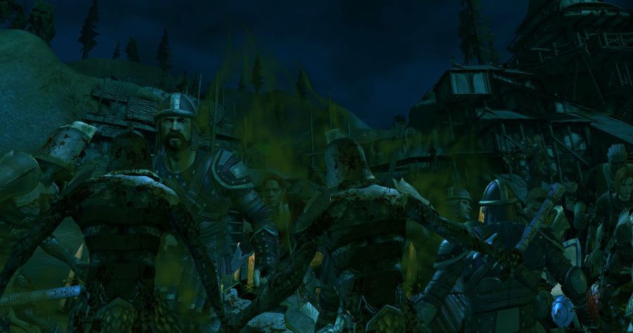Прошлые две ночи, унесшие жизни трети Редклифа, снабдили армию мертвецов бесчисленным множеством воинов. Так казалось защитникам, до которых с мертвецами добрался и зеленый туман. Заклятия лесной ведьмы давно уже перестали сдерживать все подходивших и подходивших мертвых - стремительных и сильных, таких, какими они никогда не бывали при жизни. С утробным ревом они лезли на баррикаду, круша и ломая все, до чего могли дотянуться. Наносимые раны, казалось, вовсе не причиняли им вреда, и любого можно было остановить только разрубив на куски. Воины и горожане сражались отчаянно, пытаясь помешать мертвецам влезть на баррикаду, но, одержимые злой магией, те поднимались вновь и вновь. Зеленый туман обволакивал воинов, лишая их зрения и воли к борьбе, и то и дело то там, то здесь усталый защитник обреченно опускал оружие - чтобы тут же сделаться добычей не знавших жалости тварей. Несколько недобитых мертвецов ползали под ногами воинов, хватая их за сапоги и впиваясь когтями и зубами. Часть баррикады была сломана, и с трудом сдержавшие едва не хлынувший поток тварей через эту брешь защитники насилу удерживали их натиск. Рев, крики и стоны, вой, звон оружия и треск ломавшейся стены - эти звуки способны были оглушить любого, если бы не покрывавший улицы туман, в котором вяз любой шум, затруднялось дыхание и слабела воля. Число защитников таяло, а те, что оставались, постепенно, шаг за шагом, отступали от баррикады, теснимые со всех сторон ордой мертвецов. Даже участие в бою легендарных Серых Стражей не могло пособить отчаявшимся защитникам. Все их мастерство не могло помочь разрушить злое колдовство неведомого мага. Шаг назад, еще... Спотыкаясь о трупы товарищей и изрубленных тварей, горожане и оставшиеся храмовники отходили вниз по улице, имея перед собой едва побитого врага и постепенно теряя надежду...