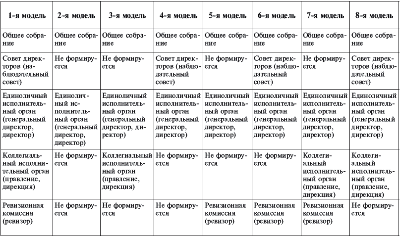 Построение модели управления в данном случае будет заключаться в необходимом и достаточном комбинировании данных органов. Закон «Об обществах с ограниченной ответственностью» позволяет сформировать восемь таких моделей.