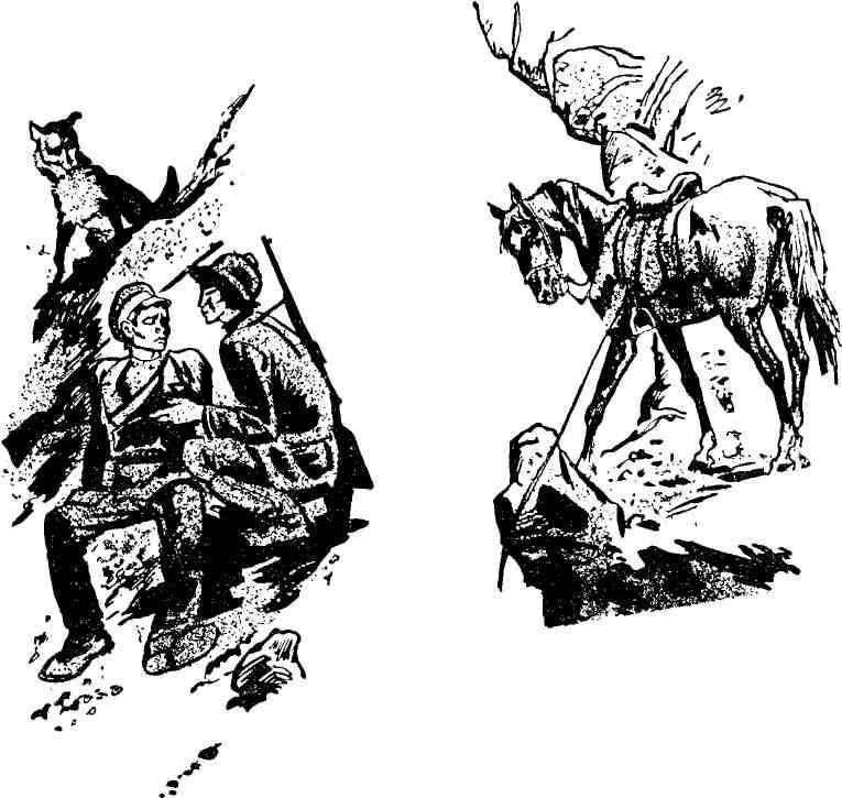 Солнце уже спряталось за вершину гор, и в ущелье, где они ехали, стало сумрачно. Буланый шагал мерно, переступая осторожно лежавшие на пути камни и бурелом. Неожиданно бежавший впереди Мойнок, радостно взвизгнув, кинулся в кусты и вынырнул оттуда вместе с овчаркой. За ними, опираясь на ружье, показался Темир. Вся фигура охотника выглядела усталой и разбитой.