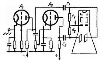 Н. — …как самый обычный выходной каскад радиоприемника, питающего громкоговоритель. К счастью, в случае электростатического отклонения задача гораздо проще; усилитель должен всего-навсего давать напряжение без тока, а следовательно, практически и мощности.