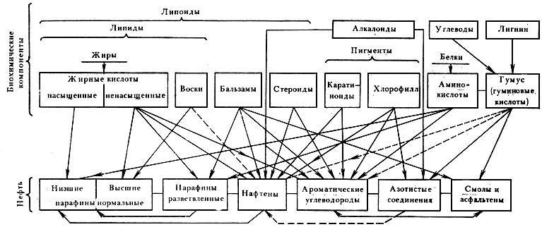 Рис. 32. Источники образования отдельных компонентов нефти