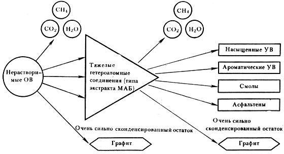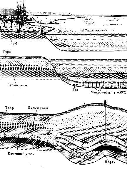 Описанная выше картина весьма схематизирована. Дело в том, что количество и битумов и углеводородов, образующихся на разных глубинах, а стало быть, и при разных температурах, во многом зависит от состава исходного органического вещества, степени его раздробленности, характера осадков, в котором оно находится и т. д. Так, установлено, что органическое вещество, представленное в основном остатками наземной растительности (так называемое гумусовое) дает при разложении больше газообразных углеводородов, жидкие углеводороды начинают образовываться из него при борее высоких температурах. Органическое вещество, накапливающееся в морских осадках, как правило, генерирует больше нефти.