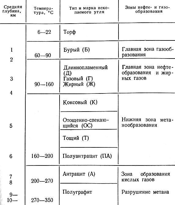 Образование газов из остатков наземной растительности в процессе формирования ископаемых углей изучено достаточно хорошо как на природном материале, так и экспериментально. Как отмечалось, уже на первой стадии при образовании торфа в болотах выделяется значительное количество метана. В дальнейшем при переходе торфа в бурый уголь, который при повышении температуры превращается в свою очередь в каменный уголь, а последний - в полуантрацит и антрацит, продолжается выделение метана и других газообразных, жидких и твердых углеводородов, а также различных летучих и нелетучих веществ - воды, углекислоты, сероводорода и др.