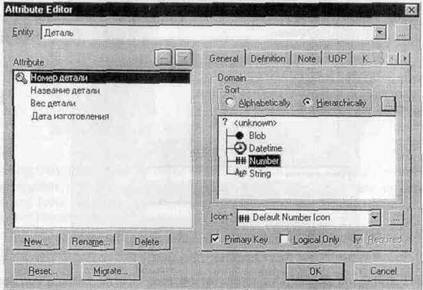 Как было указано выше, каждый атрибут хранит информацию об определенном свойстве сущности, а каждый экземпляр сущности должен быть уникальным. Атрибут или группа атрибутов, которые идентифицируют сущность, называется первичным ключом. Для описания атрибутов следует, "кликнув" правой кнопкой по сущности, выбрать в появившемся меню пункт Attribute Editor. Появляется диалог Attribute Editor (рис. 2.14).