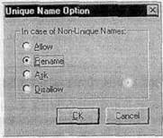 На практике такое переименование не всегда удобно, поэтому существует возможность отменить эту опцию. В диалоге Unique Name Option (меню Option/Unique Name) (рис. 2.18) можно задать следующие режимы именования атрибутов: