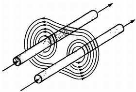 Рис. 9-10. Когда токи текут в одном направлении через два расположенных рядом проводника, их магнитные поля складываются, а сами они притягиваются друг к другу.