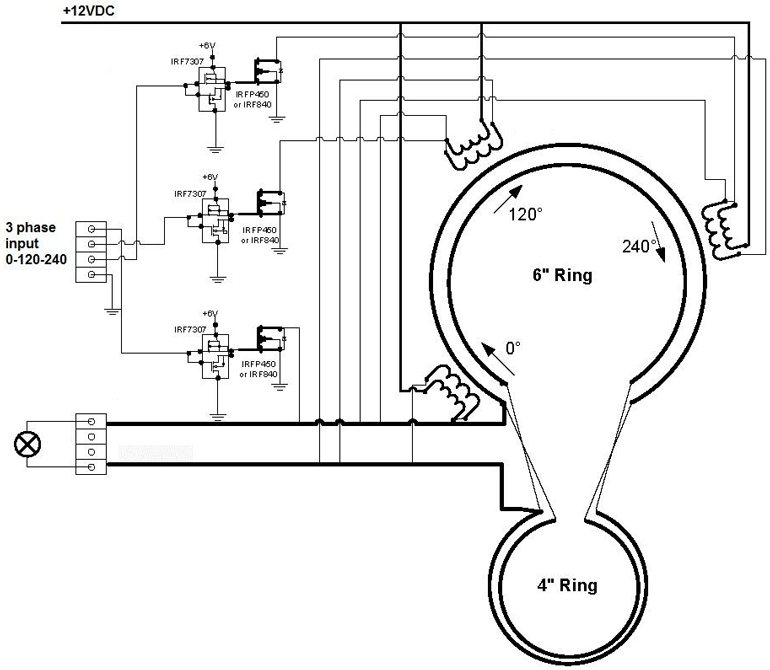 Это схема Отто, одного из последователей Стива Марка. Оригиналы схем Марка в открытой публикации не встречаются. В интернет есть видеозапись того, как после демонстрации своего изобретения комиссии экспертов, Стив Марк распилил катушку генератора, что бы показать, что внутри ничего нет, в том числе нет ферритового сердечника. Первая катушка, которую он называл «коллектор – накопитель» имела 3 витка многожильного провода. Это скорее не катушка, а толстый медный провод, к торцам которого подключена цепь нагрузки. На ней намотаны катушки трехфазной схемы возбуждения, которые были подключены к ключам на ламповых триодах. Каждая катушка возбуждения состоит из двух частей, имеющих встречную намотку. При этом, трехфазная схема создает «вращающееся поле», хотя этим принцип работы не объясняется. На выводах «коллектора – накопителя» образовывалась разность потенциалов, электродвижущая сила, и в цепи нагрузки возникал ток.