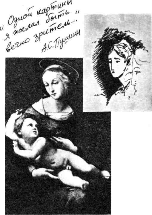 Совсем недавно в музейных фондах Ленинграда была обнаружена ваза с сюжетом Дидоны: Дидона в зеленой тунике, в белом тюрбане сидит и слушает влюбленного в нее Энея. Ваза голубого цвета, ручки в виде золотых орлиных голов. Зеленую тунику и белый тюрбан надевала Наталья Николаевна. Ведь было время, когда она выступала в любительском спектакле — была сестрой Дидоны. Ваза, в память об этом времени, передана на царскосельскую дачу: Дидона — божество, преобразившееся в смертную женщину. Дидона… Сестра Дидоны… Мадонна Бриджуотерская… Именно перед этой картиной, копией с Рафаэля, стоял в Петербурге Пушкин и сравнивал именно эту «Бриджуотерскую мадонну» с Натальей Николаевной. Литография с мадонны Рафаэля находится на царскосельской даче. Подлинник картины — в Национальной галерее Шотландии. Исполнена мадонна Рафаэлем около 1508 года. «Тончайшая светотеневая дымка — знаменитое сфумато — окутывает фигуру, придает нежность взгляду, улыбке». А куда делась бывшая в Петербурге копия, которую выдавали за оригинал, неизвестно.