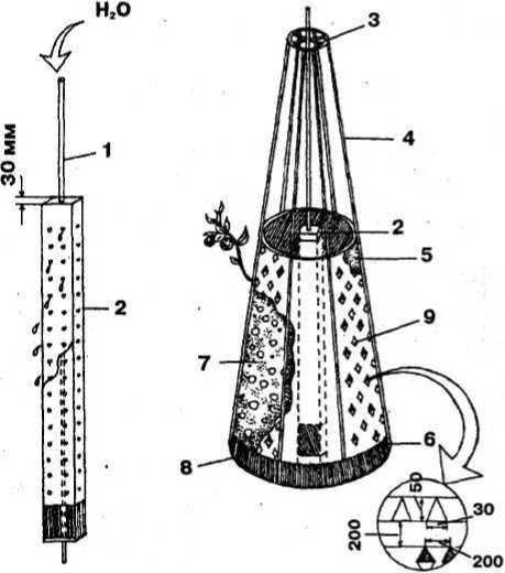 1 — опорная A-дюймовая труба для полива; 2 — камера для полива из пенопласта и т. п.; 3 — верхнее опорное кольцо (можно использовать от старого детского велосипеда); 4 — опорный прут для каркаса; 5 — жесть, мешковина, плёнка; 6 — рубероид шириной 200-300 мм, если каркас обтягивается плёнкой; 7 — рабочая смесь; 8 — нижнее опорное кольцо из прута диаметром 10 мм; 9 — ромбовидные отверстия для рассады или посева семян