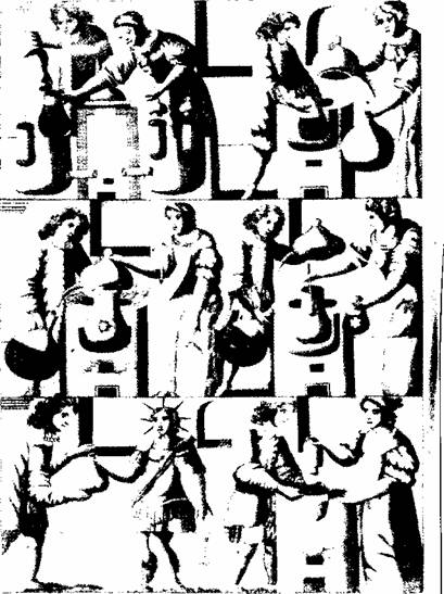 Рис. 72. Алхимики за работой на различных стадиях процесса. Просветление персонифицировано солнцем (слева внизу), которое держит в руке золотой цветок. символизирующий философский камень.