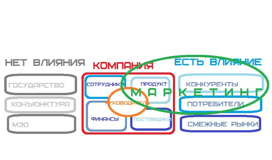 Из определения мы поняли, что маркетинг затрагивает большое количество сфер. Но каким бы он был, если бы мы взяли, например, все подразделения компании, сопоставили бы их с рынком и обрисовали зону влияния маркетинга? Как раз это я сделала для вас. Результат я отразила на схеме.