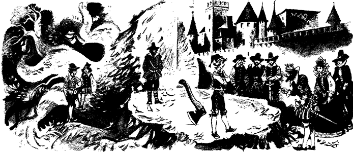 Разозлился король и наложил тогда такую пеню[9]: «Станет кто дуб рубить и не срубит, станет кто колодец копать и не выкопает, отсекут ему уши и на дальний остров сошлют». Почесали старшие братья в затылке: кто его знает, как дело обернется. Но крепко они на себя надеялись и думали, что уж им-то все по плечу.
