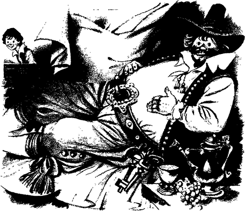 От неожиданности Великан даже споткнулся, но, опомнившись, бросился догонять маленького Плута. Однако далеко не убежал, потому что зацепился в темноте за корягу, грохнулся на землю и расшиб себе нос. Что ж, и так бывает. А Плут-Малыш вскочил на мула и в миг один оказался у королевского замка.