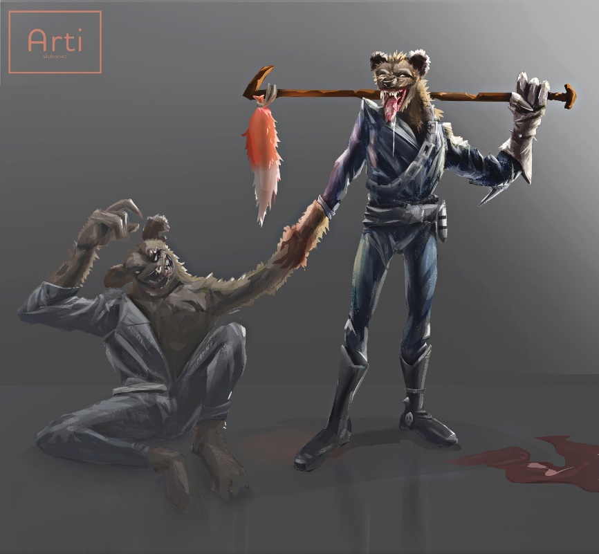 Это были незнакомцы. Две абсолютно одинаковые высокие фигуры в потёртых байкерских куртках. На шеях цепи, на карманах – железные заклепки с черепами. Рыжие в чёрных пятнах морды, округлые уши и насмешливый оскал. Тонкие нити слюны тянутся с подбородка. Гиены.
