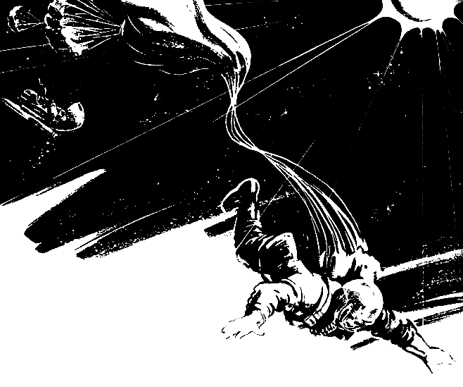 И вдруг, какая-то могучая сила дернула его за пояс, начала стискивать в скафандре, будто стремясь сокрушить позвонки. Железными тисками сжало виски. Горячим туманом затянуло глаза… Это автоматически раскрылся парашют, затормозилось движение и начала возвращаться сила тяжести.