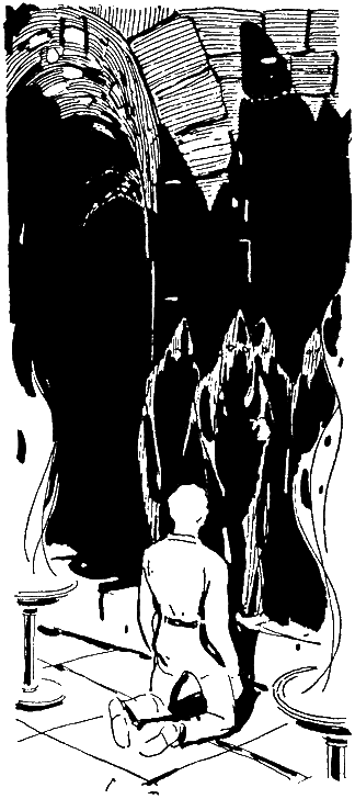 Полумрак. Тревожно мечется пламя немногочисленных факелов. Суетливо прыгают на влажных каменных стенах круглого высокого помещения зловещие тени. Люди в черном стоят вокруг. Нет, не люди, а какие-то манекены, одетые в черное — и только в прорезях остро сверкают глаза.